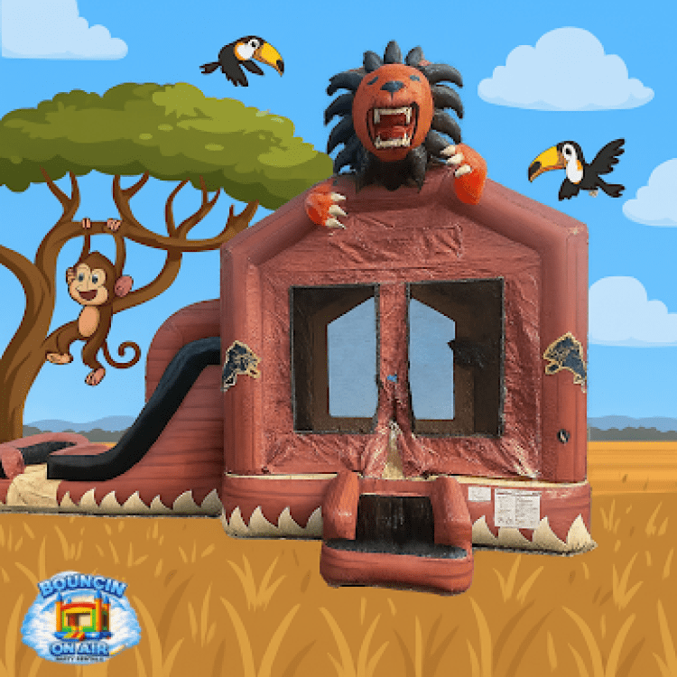 Listen to the Lion roar π¦in this incredible bounce house with two slides! There's plenty of room to jump around π€ΈβοΈbefore sliding into a cool, refreshing pool of water!π¦
