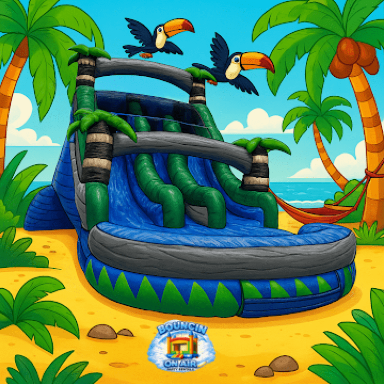 This dual lane offers twice the excitement in a lush tropical rainforest setting! 🌴 Race against the clock as you glide down the slick slide and splash into a crystal-clear blue pool! 🥥